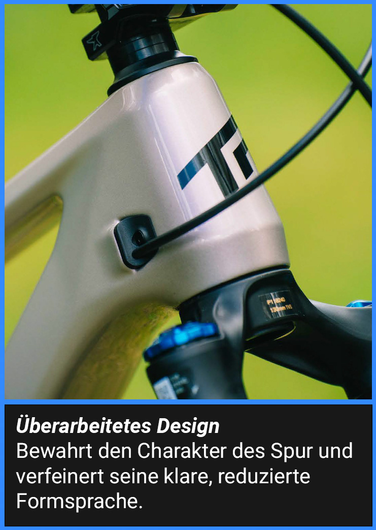 Das überarbeitete Spur vereint das bekannte, ultraleichte Fahrgefühl mit einem spürbaren Plus an Federweg und einer Reihe gezielt verfeinerter Features für maximale Performance. Im Zuge des Design-Updates wurde der Rahmen zudem um ein integriertes Rahmenstaufach (B.O.O.M. Box) sowie eine FlipChip-Funktion zur individuellen Geometrie-Anpassung erweitert.